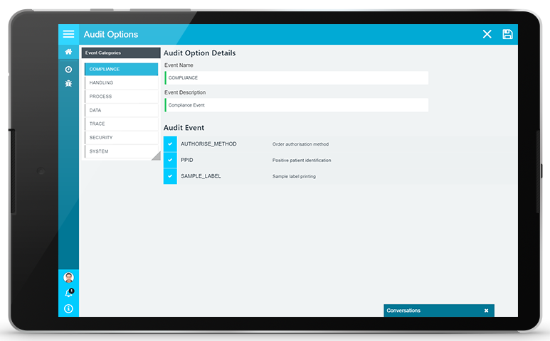 The PAMS audit trail can collect audit information regarding every event and action that that takes place within PAMS, but allows you to determine the exact information that should be maintained to meet your needs. Configuration options enable to refine and select the exact records that should be maintained for a given process (e.g. sample collections), for specific groups or roles (e.g. couriers, nurses) or for specific functions or actions (e.g. PPID compliance). You can determine your own audit needs and the level of audit information that you require to ensure that the audit information that you maintain is both efficient and effective.